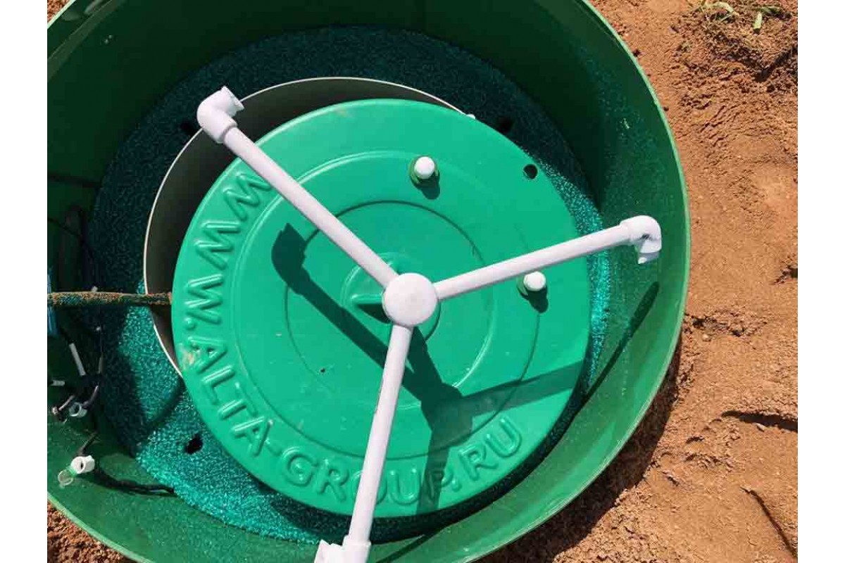 Очищенная вода удаляется в напорном режиме насосом из встроенного колодца (рассчитано на условия, когда невозможен отвод очищенной воды в самотечном режиме).