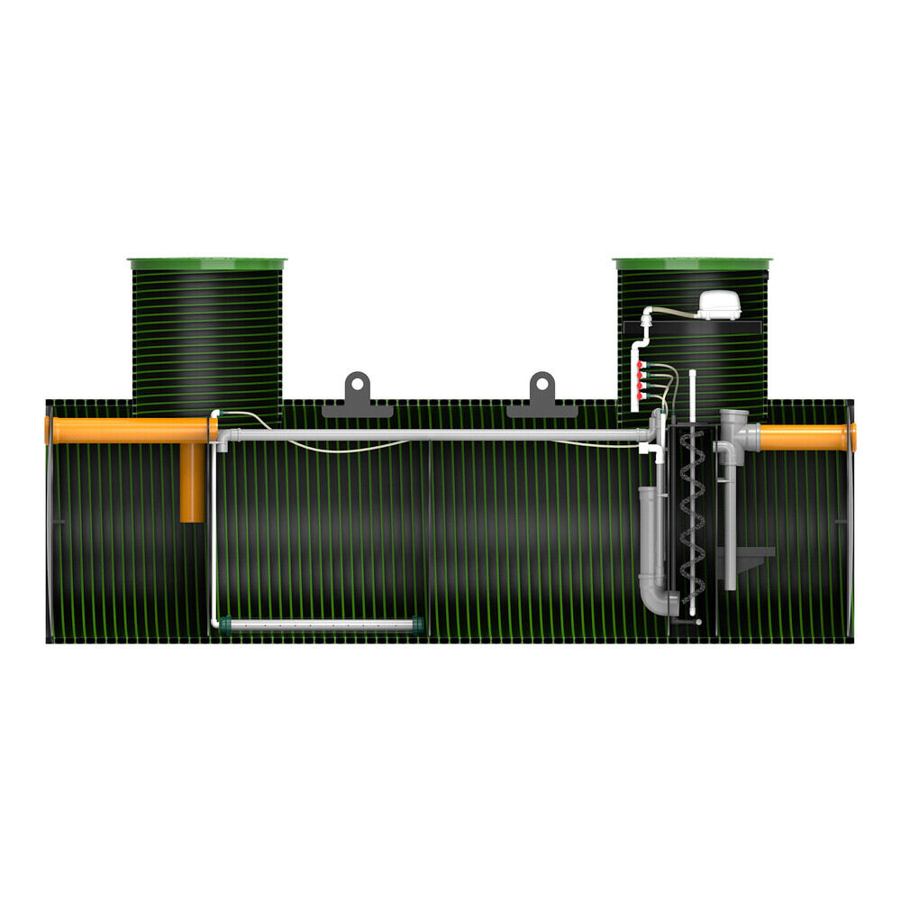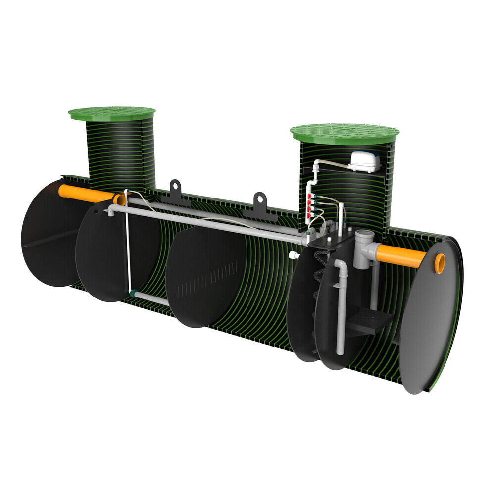 Как и 95% всех станций очистки хоз. бытовых стоков, которые есть на рынке СНГ, принцип работы данного септика основан на мелко-пузырчатой аэрации, которую создает аэратор (компрессор, воздуходувка) поставляемый в комплекте станции. Поэтому, все септики, которые работают по данному принципу являются энергозависимые. За счет подачи воздуха, а так же за счет дополнительных механизмов очистки (аэрлифты, жироуловитель, иловый отстойник, сотовая биозагрузка, ершовая загрузка) происходит полная очистка хоз. бытовых стоков до уровня технической воды. Степень очистки станции при идеальных условиях достигает 98%. Вода на выходе не имеет запахов, абсолютно прозрачна и бесцветна. Такую, экологически чистую техническую воду можно достаточно долгое время дренировать в грунт, а так же использовать в качестве воды для полива, мойки и т.д. Данная станция подходит как для постоянного проживания, так и для сезонного (например, дачного варианта). Вопреки всем мифам, в станцию не нужно добавлять никаких бактерий! Процесс очистки полностью автономный.