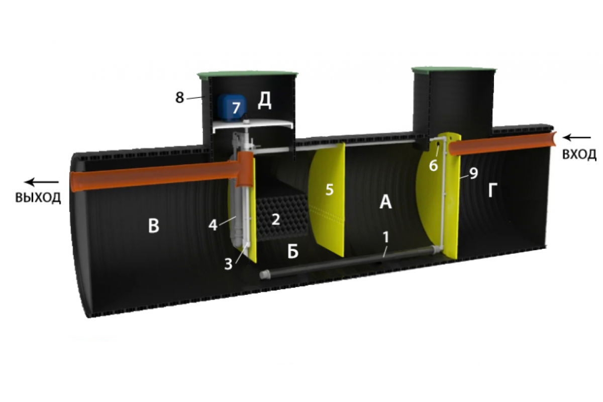 Трех-камерная станция биологической очистки имеет горизонтальное исполнение для простого и незатратного монтажа при высоких УГВ (УГВ - уровень грунтовых вод). За счет горизонтального исполнения станция имеет минимальную монтажную глубину ( всего лишь 1300-1500 мм до дна котлована!) что делает ее лидером среди всех станций биологической очистки на рынке СНГ по удобству и простоте монтажа при высоком уровне грунтовых вод. Не требует якорения! Всплытие исключено!