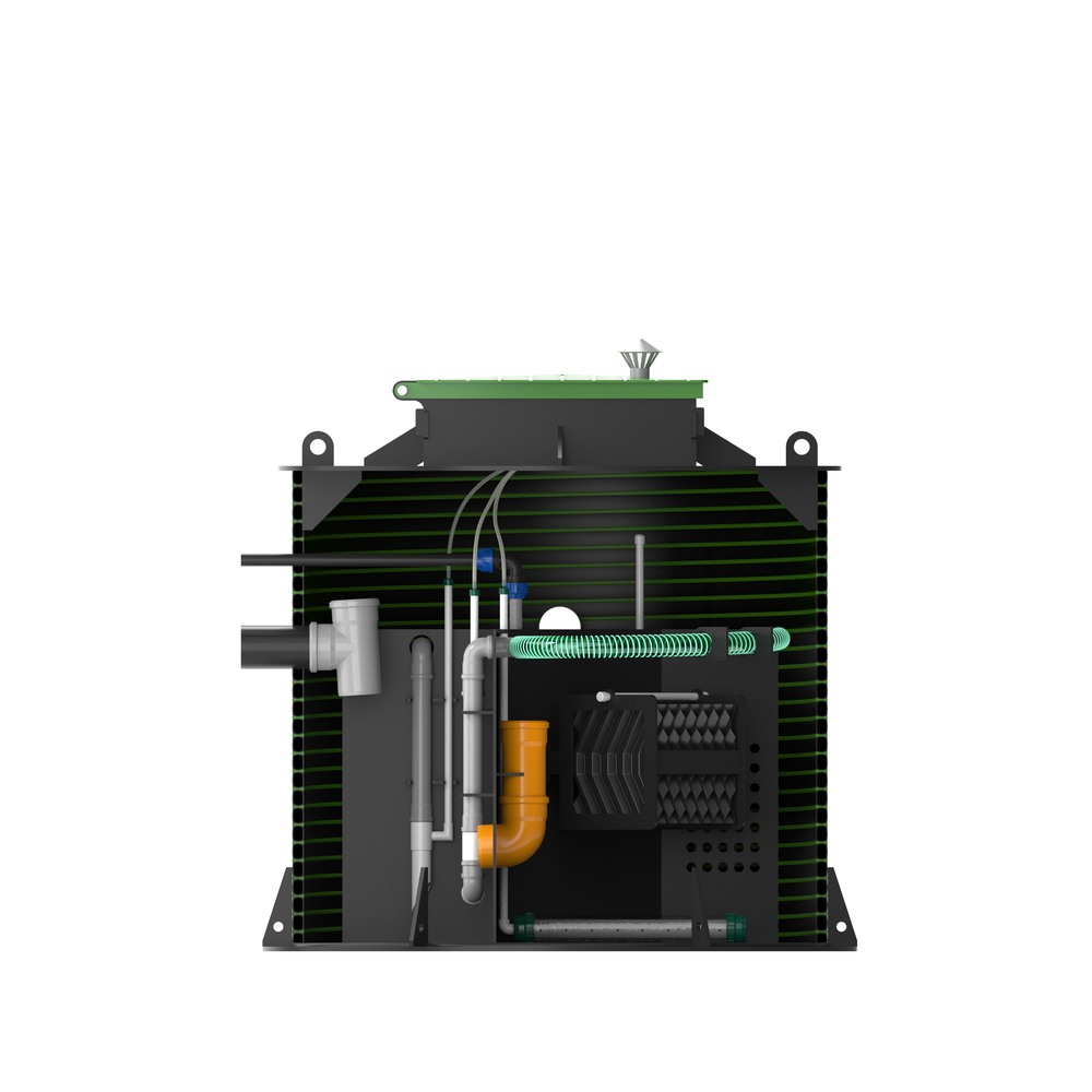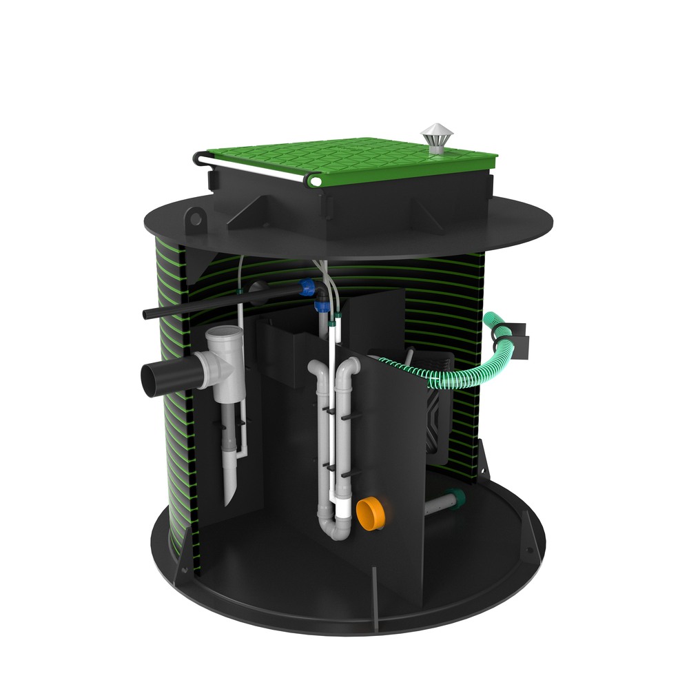Сток из дома попадает в приемную камеру (усреднитель) (1), в усреднителе происходит усреднение сточных вод по количественным и качественным показателям. Так же в усреднителе установленно устройство для улавливания волос. Далее сток попадает в аэротенк (2), в котором происходит насыщение стока кислородом при помощи дискового аэратора, что создаёт благоприятную среду для аэробных микроорганизмов, которые непосредственно учавствуют в процессе очистки. В аэротенке уставлен блок биологической загрузки предназначенный для колонизация микроорганизмов. Далее сток перетекает в камеру успокоитель (3). В успокоителе проходт процесс осаждения взвесей и удаление ила и жира на повторную доработку. Из успокителя (3) при самотёчном водоотведении сток через отводящий патрубок выходит за пределы станции. При принудительном водоотведении, в насосную камеру (4) устанавливается насос и выбрасывается за пределы станции насосом.