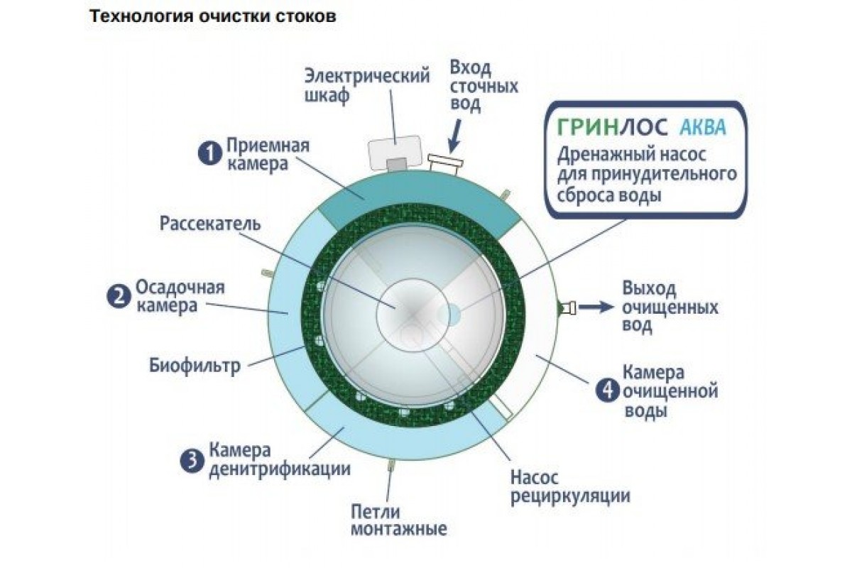 Очистка стоков происходит с помощью Аквабных бактерий, расположенных на биофильтре. Многократное взаимодействие загрязненной жидкости с бактериями осуществляется благодаря работе насоса-рециркулятора.