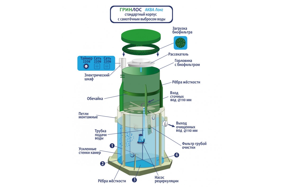 Также этот насос позволяет стокам насыщаться кислородом, что необходимо для поддержания жизнедеятельности бактерий. Все электрические элементы в септике ГРИНЛОС Аква Супер Лонг работают по таймеру, что позволяет значительно сэкономить на электричестве и увеличить временной интервал между обслуживанием септика.