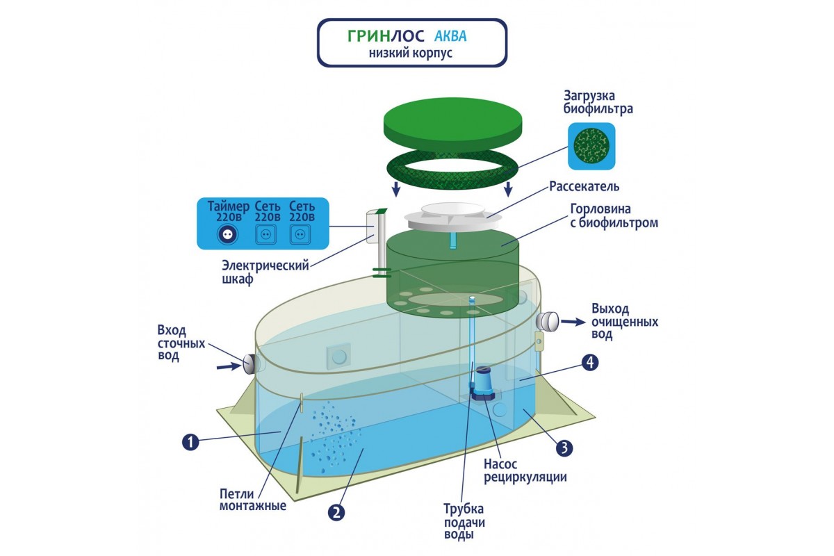 ГРИНЛОС Аква изготавливаются из вспененного полипропилена чешского производства. Нижний уровень разделен на четыре отсека со специальными технологическими переливами. Перетекая из одного отстойника в другой, стоки проходят первоначальный процесс отстаивания, усреднения стоков, отделения нерастворимых фракций (жиров и т.д.), которые остаются в первом отсеке. При этом уже в первом отсеке начинается очистка стоков свободным активным илом. Затем, из третьего отсека, стоки посредством дренажного насоса подаются на верхний уровень, на специальный разбрызгиватель, через который происходит орошение биофильтра.