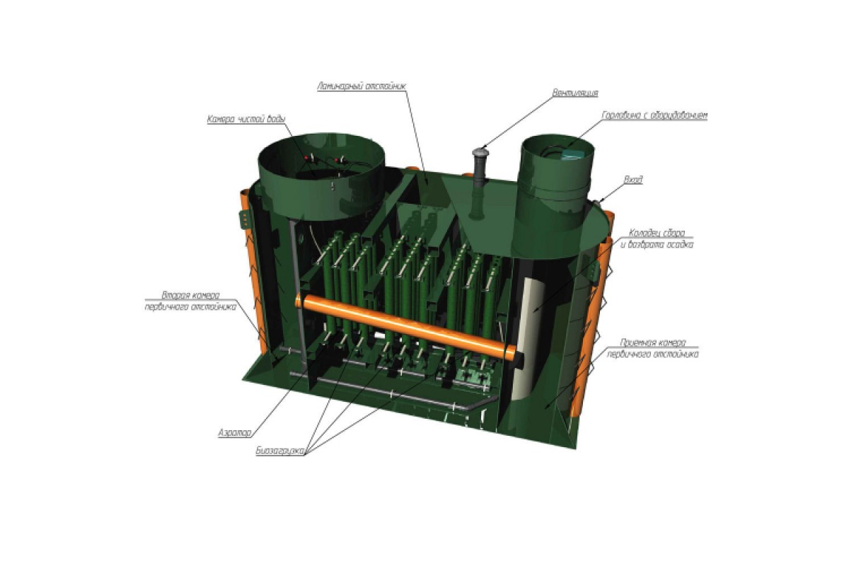Сток поступает в приемную камеру-накопитель, где происходит накопление нерастворимых взвешенных веществ поступающих со сточными водами. Одновременно в данной камере происходят анаэробные процессы денитрификации, цель которых удаление азота из стока. Перелив в камере-накопителе расположен таким образом, чтобы сточные воды протекали с наименьшей скоростью, благодаря чему в каждой камере происходит оседание грубодисперсных взвешенных частиц на дно.