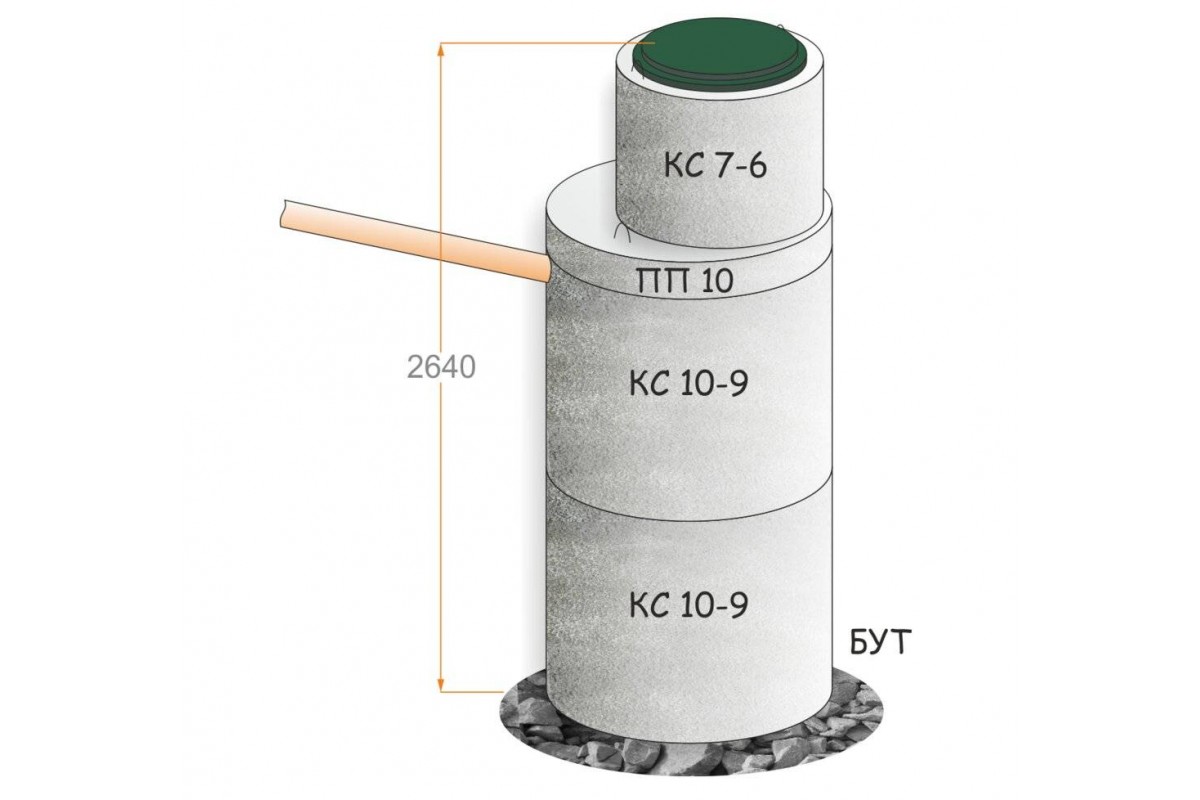 Выгребная яма на базе метровых колец. Это железобетонный колодец из колец диаметром 1 метр. Общий рабочий объем составляет 1.75 м. куб. Подойдет для сезонного использования в местах где нет высокого уровня грунтовых вод.