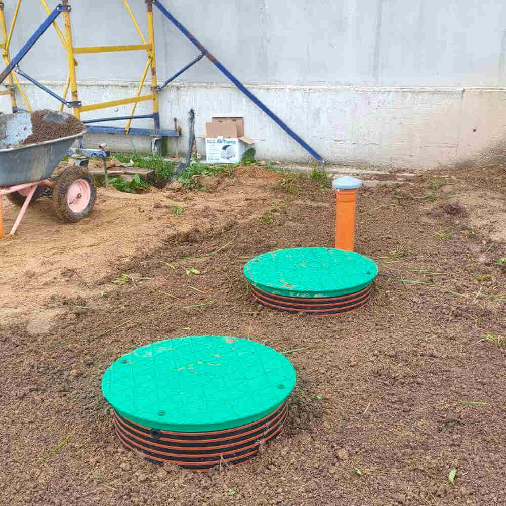 • Нижняя часть приемной камеры является иловым стабилизатором, где происходит конечное осаждение активного ила, эта камера является хранилищем всей переработанной твердой массы. Именно из этой камеры необходимо периодически удалять твердый осадок в ручную при помощи встроенного насоса, либо при помощи дренажного насоса, либо при помощи илососной машины (ассенизатора). Остатки взвешенного активного ила с поверхности камеры илового стабилизатора перетекают снова в приемную камеру, таким образом в системе поддерживается постоянная циркуляция активного ила, который играет ключевую роль в очистке стоков. Слой чистой воды образовываясь на поверхности в камере успокоителе вытекает через жироуловитель 2 самотеком из станции проходя дополнительную очистку через ершовую загрузку. Далее чистая техническая вода поступает в грунт при помощи дренажных систем (дренажного колодца, дренажных полей фильтрации, инфильтраторов)
