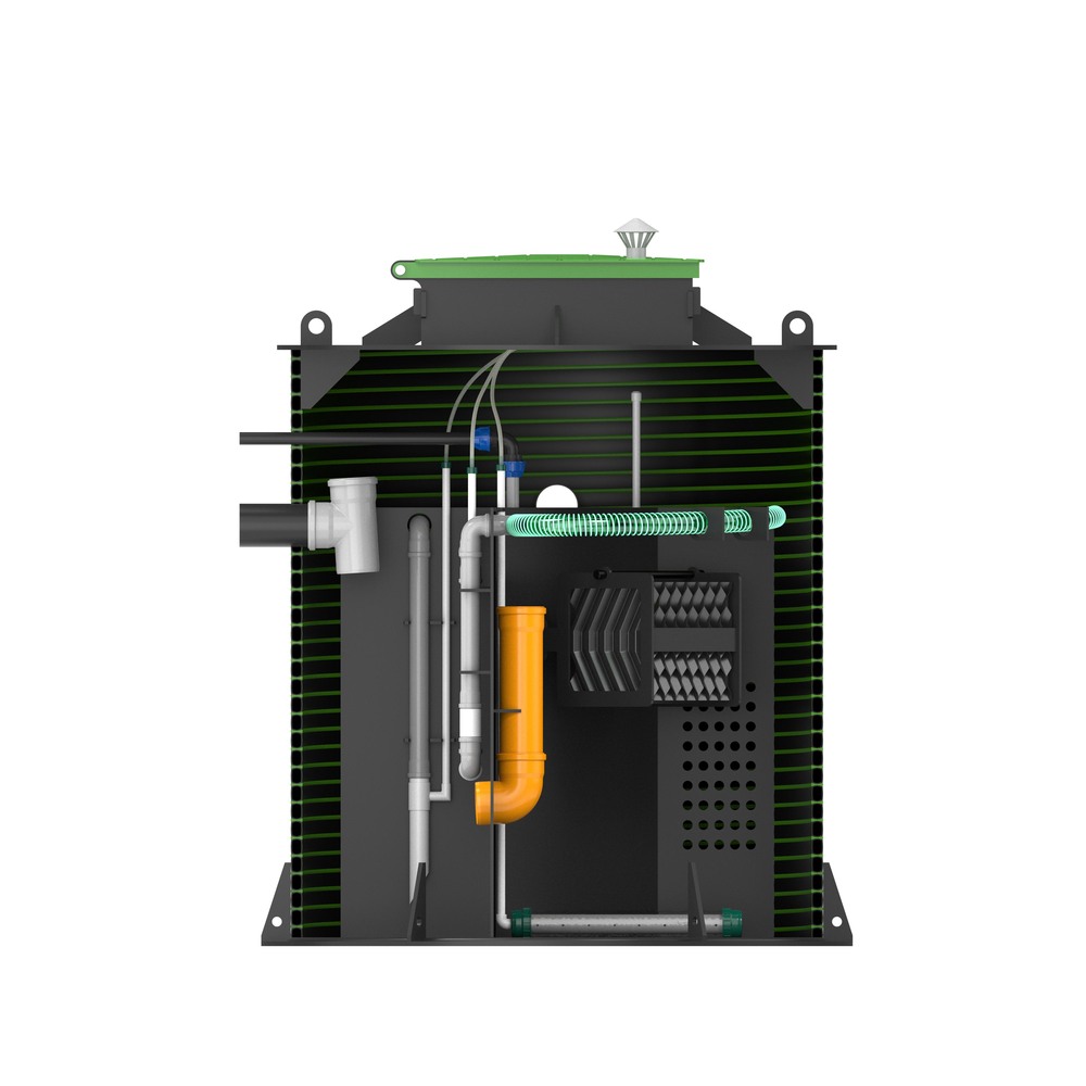 Сток из дома попадает в приемную камеру (усреднитель) (1), в усреднителе происходит усреднение сточных вод по количественным и качественным показателям. Так же в усреднителе установленно устройство для улавливания волос. Далее сток попадает в аэротенк (2), в котором происходит насыщение стока кислородом при помощи дискового аэратора, что создаёт благоприятную среду для аэробных микроорганизмов, которые непосредственно учавствуют в процессе очистки. В аэротенке уставлен блок биологической загрузки предназначенный для колонизация микроорганизмов. Далее сток перетекает в камеру успокоитель (3). В успокоителе проходт процесс осаждения взвесей и удаление ила и жира на повторную доработку. Из успокителя (3) при самотёчном водоотведении сток через отводящий патрубок выходит за пределы станции. При принудительном водоотведении, в насосную камеру (4) устанавливается насос и выбрасывается за пределы станции насосом.