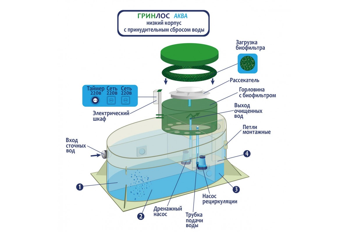 ГРИНЛОС Аква изготавливаются из вспененного полипропилена чешского производства. Нижний уровень разделен на четыре отсека со специальными технологическими переливами. Перетекая из одного отстойника в другой, стоки проходят первоначальный процесс отстаивания, усреднения стоков, отделения нерастворимых фракций (жиров и т.д.), которые остаются в первом отсеке. При этом уже в первом отсеке начинается очистка стоков свободным активным илом. Затем, из третьего отсека, стоки посредством дренажного насоса подаются на верхний уровень, на специальный разбрызгиватель, через который происходит орошение биофильтра.