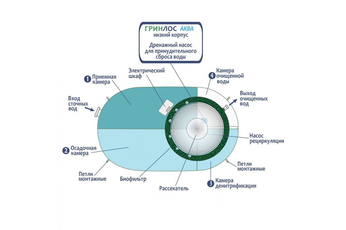 ГРИНЛОС Аква изготавливаются из вспененного полипропилена чешского производства. Нижний уровень разделен на четыре отсека со специальными технологическими переливами. Перетекая из одного отстойника в другой, стоки проходят первоначальный процесс отстаивания, усреднения стоков, отделения нерастворимых фракций (жиров и т.д.), которые остаются в первом отсеке. При этом уже в первом отсеке начинается очистка стоков свободным активным илом. Затем, из третьего отсека, стоки посредством дренажного насоса подаются на верхний уровень, на специальный разбрызгиватель, через который происходит орошение биофильтра.